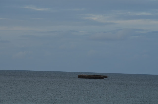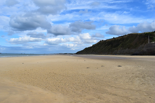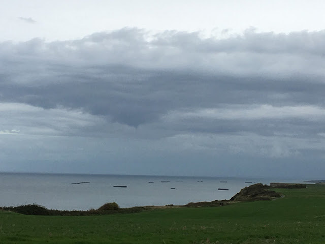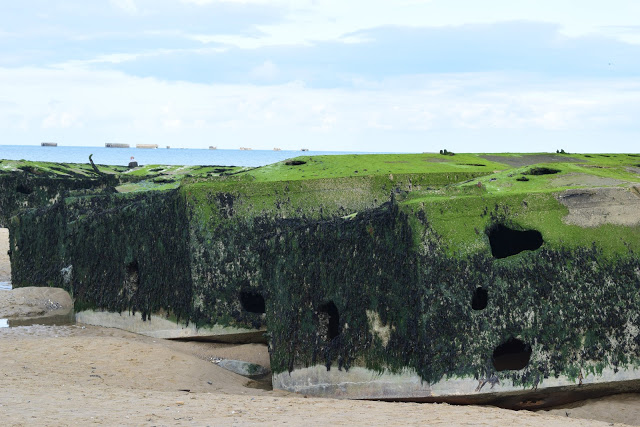 Arrivée plus bas, nous découvrons GOLD BEACH, cette immense plage ou l’on peut encore apercevoir de nombreuses barges du débarquement.