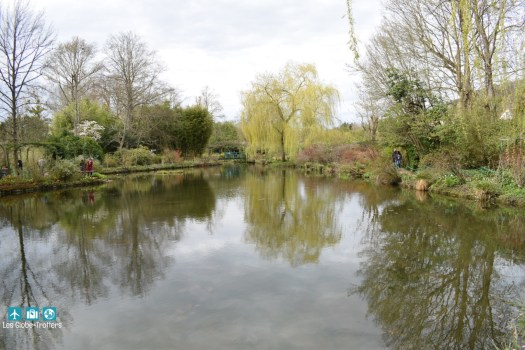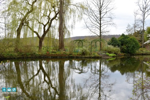 L’autre jardin, le jardin d’eau se situe en fait l’autre côté de la route. Nous y accedons par un petit tunnel souterrain. Monet a toujours été fasciné par les jeux de lumière et les reflets des nuages sur l’eau. Ses nombreuses toiles peintes sur son atelier flottant, à Argenteuil ou sur les canaux de Hollande, montrent sa fascination pour les reflets renversés dans ces miroirs liquides.