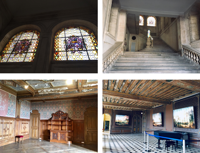 La cour du bas, dite des écuries, entourée de douves, est close par un magnifique portail aux armes des La Rochefoucauld.