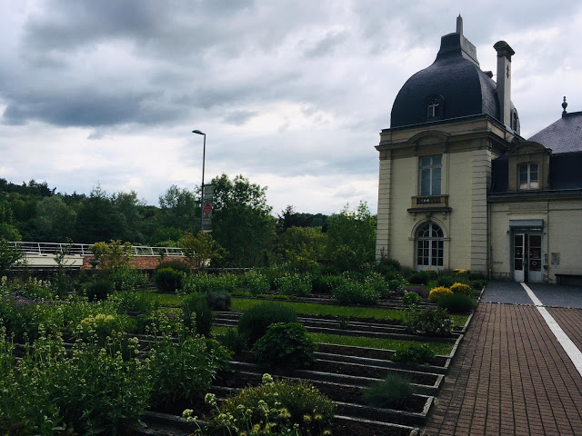 Devant le château, les parterres fleuris en forme de simples rectangles allongés simulent les toiles qui étaient étendues au soleil dans les champs entourant la manufacture. Ils sont l’œuvre de Jean-Max Albert.