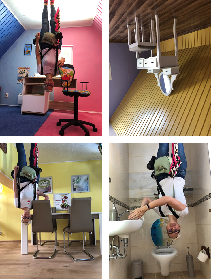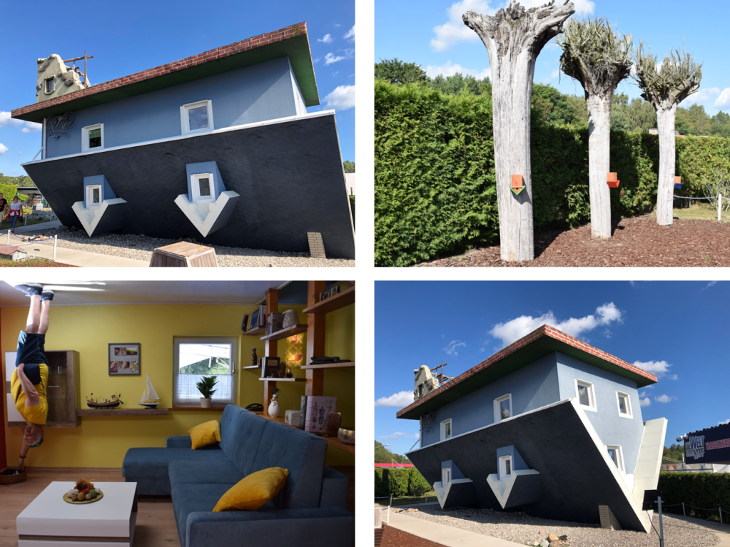 Cette maison à l’envers, bien qu’entièrement équipée, ne rendrait pas la vie simple à ceux qui voudraient y vivre. En effet, l’intérieur de la maison est également à l’envers, pas évident de s’asseoir sur un canapé qui se trouve… au dessus de votre tête ! Il s’agit d’une création artistique nommée « The world stands on its head ».