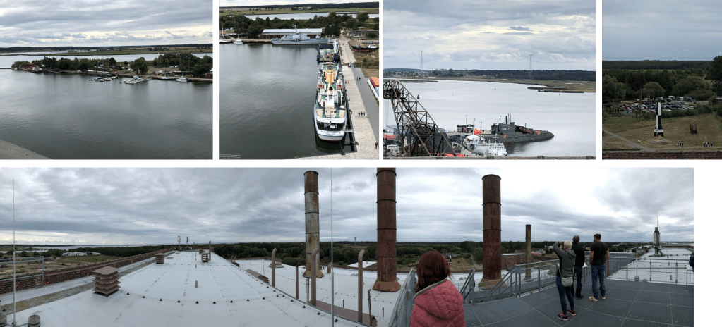 Un ascenseur nous mène à une plate-forme d’observation sur le toit de la centrale. À une hauteur de 30 mètres, nous pouvons découvrir la complexité et la énormité du projet Peenemünde.