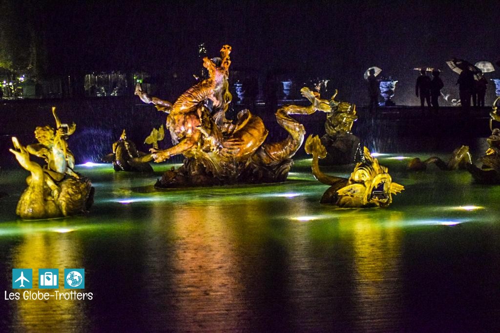 Nous déambulons de bosquets en bosquets, de fontaines en fontaines pour découvrir des surprises d’architectures et des sculptures mises en avant par des jeux de lumières et par les fontaines. Cette année nous avons choisi de passer de longs moments vers le bassin de Neptune, le bassin du Dragon, le bosquet de l’Arc de Triomphe, moins connu que le bosquet de l’Encelade.