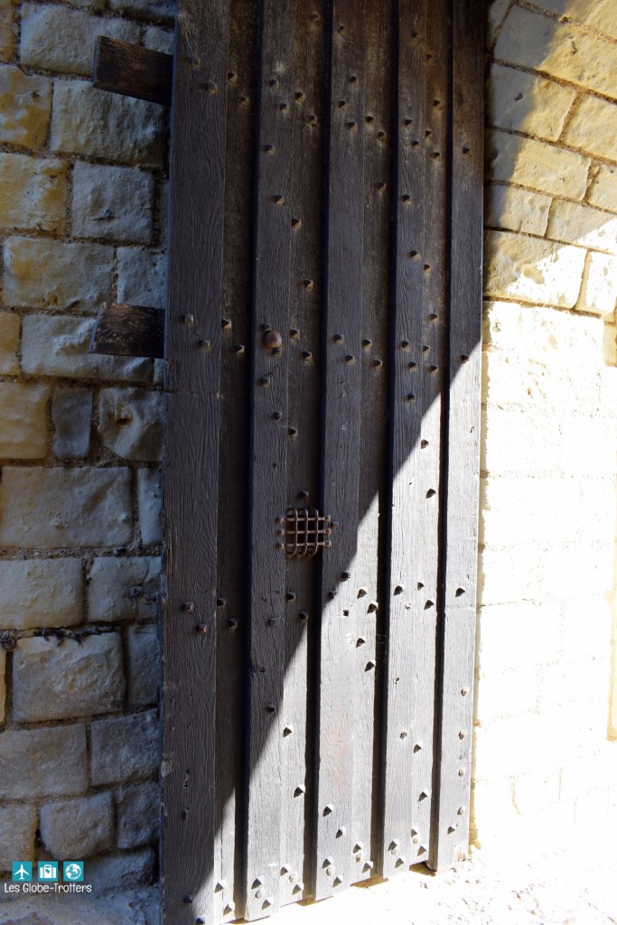 Après avoir passé le bâtiment d’accueil, nous pénétrons dans la forteresse en passant sous la tour de l’horloge. Elle est en quelque sorte la tour « porte » du château du Milieu, créée par Jean sans Terre en 1200 lorsqu’il prépare la Forteresse à la guerre. Cette tour-porte est ménagée dans une tour longue et étroite à l’extrémité semi-circulaire. Située en retrait du rempart, elle est défendue côté est par trois archères. La porte d’entrée s’ouvre dans l’une de ces archères et débouche sur un escalier droit. La tour était également accessible par le chemin de ronde. Elle connaît par la suite plusieurs campagnes de modifications. A la fin du XIVe siècle, la tour est rehaussée pour accueillir une cloche à son sommet et atteindre sa hauteur actuelle.