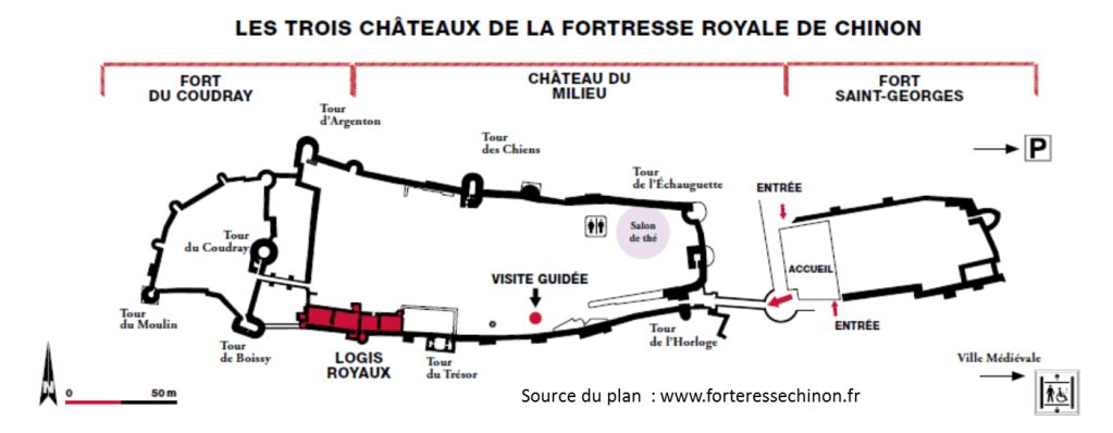 Aujourd’hui nous partons à la découverte de la forteresse royale de Chinon. La forteresse royale de Chinon, comme beaucoup de châteaux, est construite sur un éperon rocheux dominant la Vienne et la ville. Cette position stratégique lui permet de s’assurer le contrôle du passage sur la Vienne, affluent de la Loire. Le bourg s’est développé en contrebas, sur la rive.