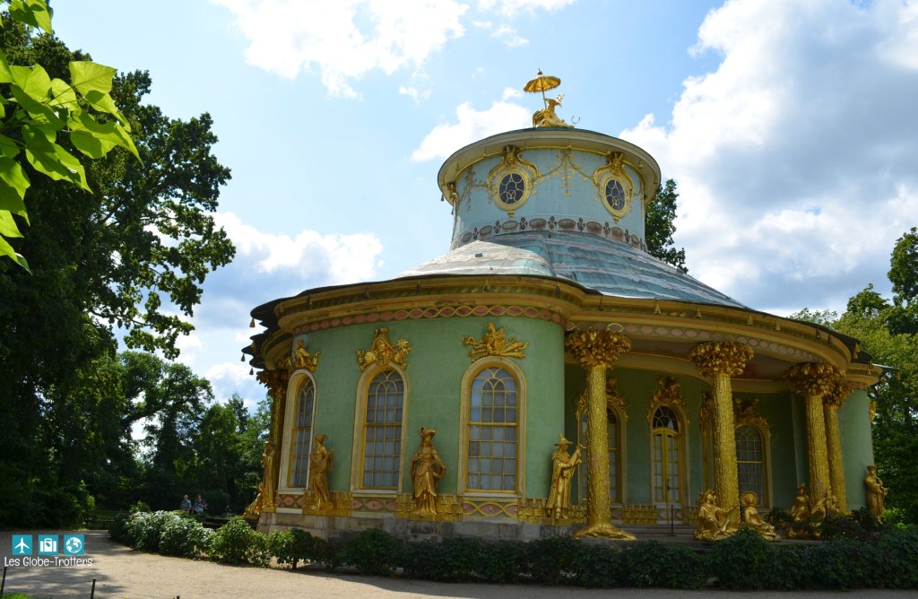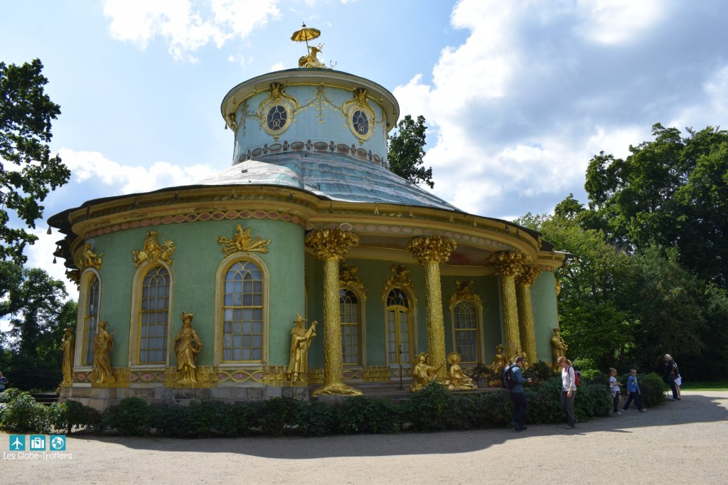 Inspirée d’un pavillon du parc du château de Lunéville, la Maison chinoise fut conçue par Johann Gottfried Büring. De charmants petits cabinets s’ouvrent sur la salle ronde, décorée de peintures orientales. On peut y voir un mandarin sous un parasol siègeant au sommet du toit ; les colonnes de l’édifice en forme de palmiers ; des personnages exotiques dorés que l’on croirait figés. Cette chinoiserie est une folie du XVIIIe siècle, archétype d’un Extrême-Orient idéalisé.