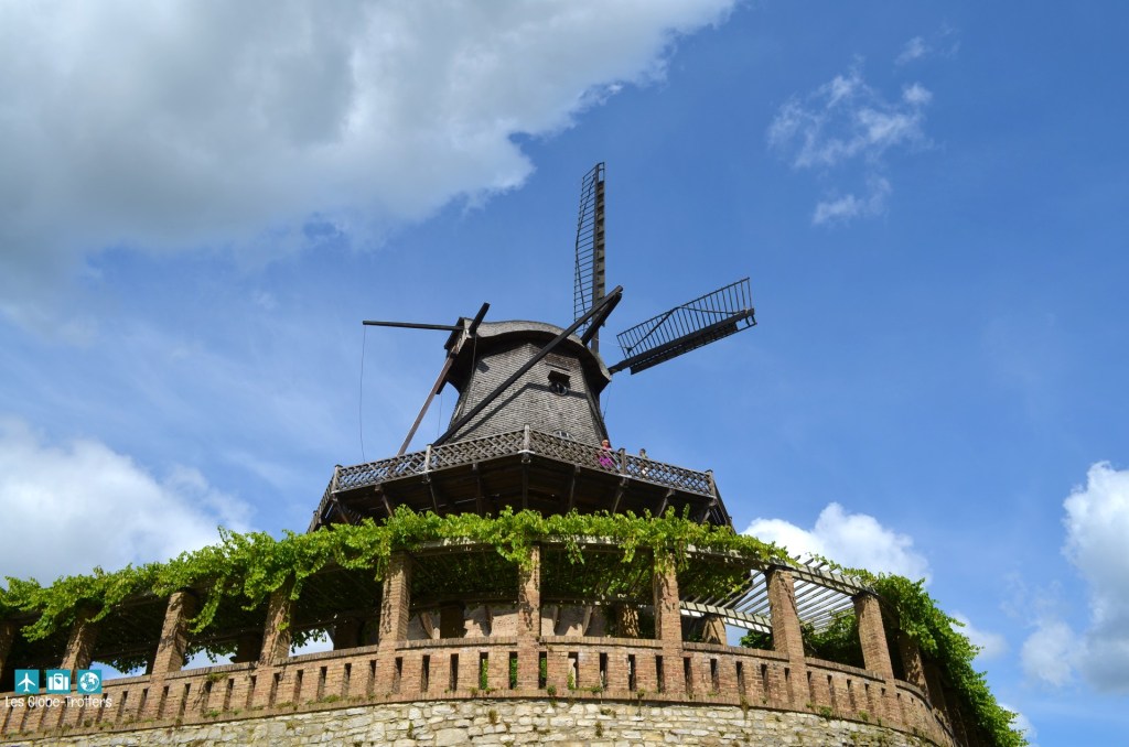 Le troisième moulin. Incendié en 1945, le Vieux moulin fut reconstruit en plusieurs étapes à partir de 1983. Il correspond à celui édifié entre 1787 et 1791. La présence d’un moulin sur les hauteurs de Sans-Souci remonte bien avant la construction du château de Frédéric Le Grand.