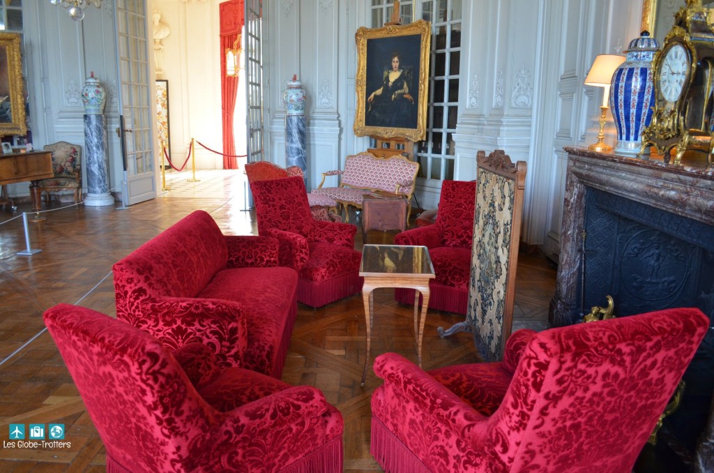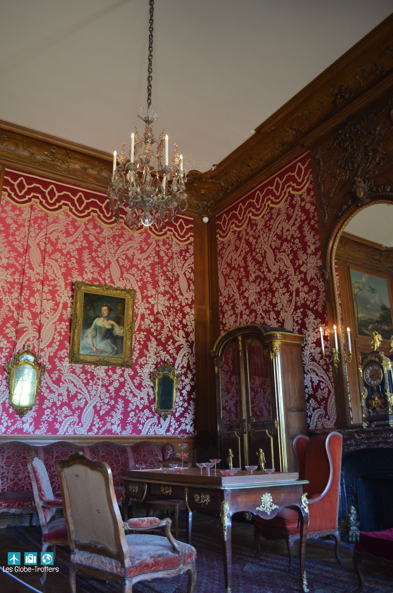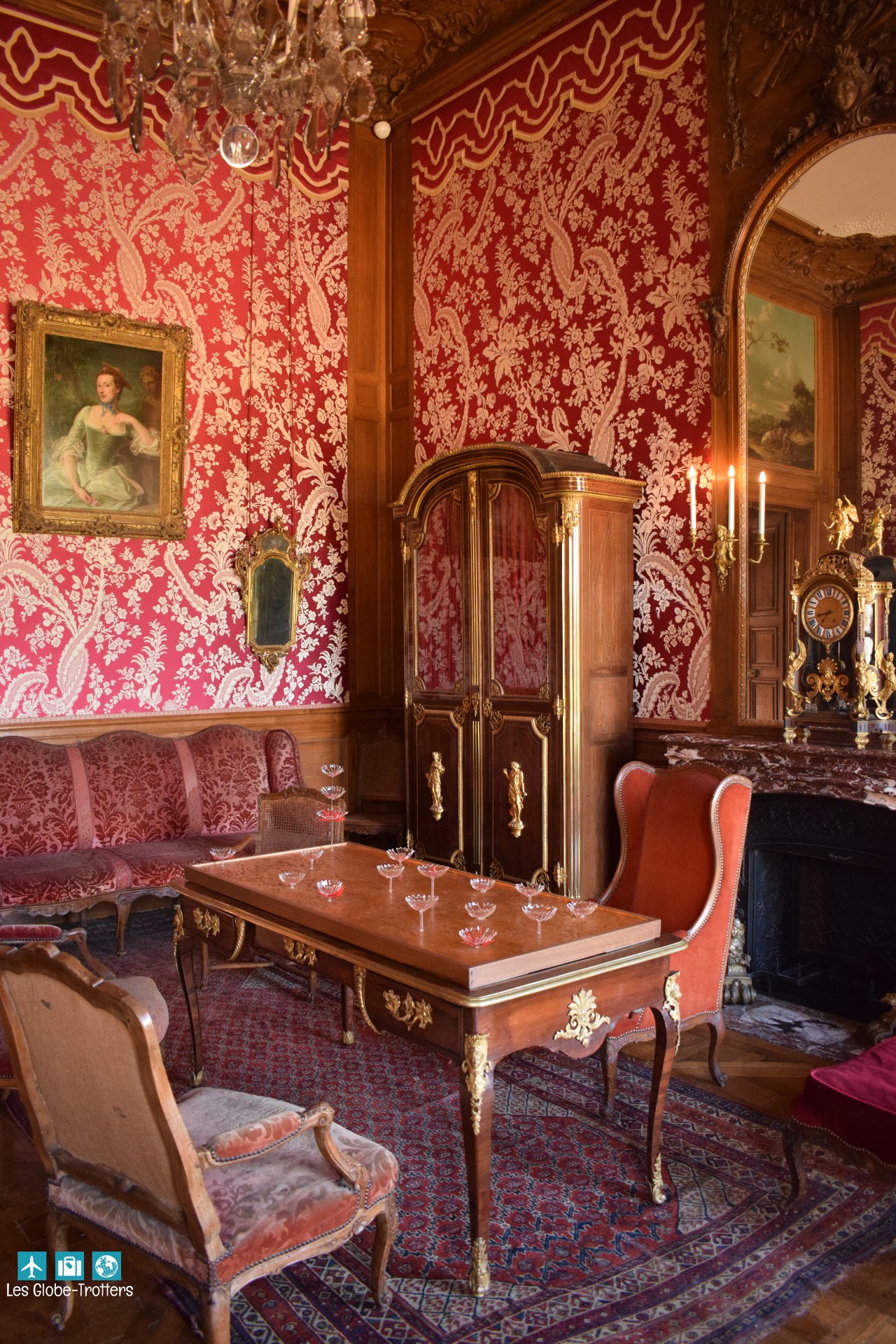 Le salon rouge. Il a été transformé vers 1928 par Charles Cahen d’Anvers en bureau. La soierie rouge a été restaurée à l’identique de celle qui décorait cette ancienne chambre de Louise Cahen d’Anvers.