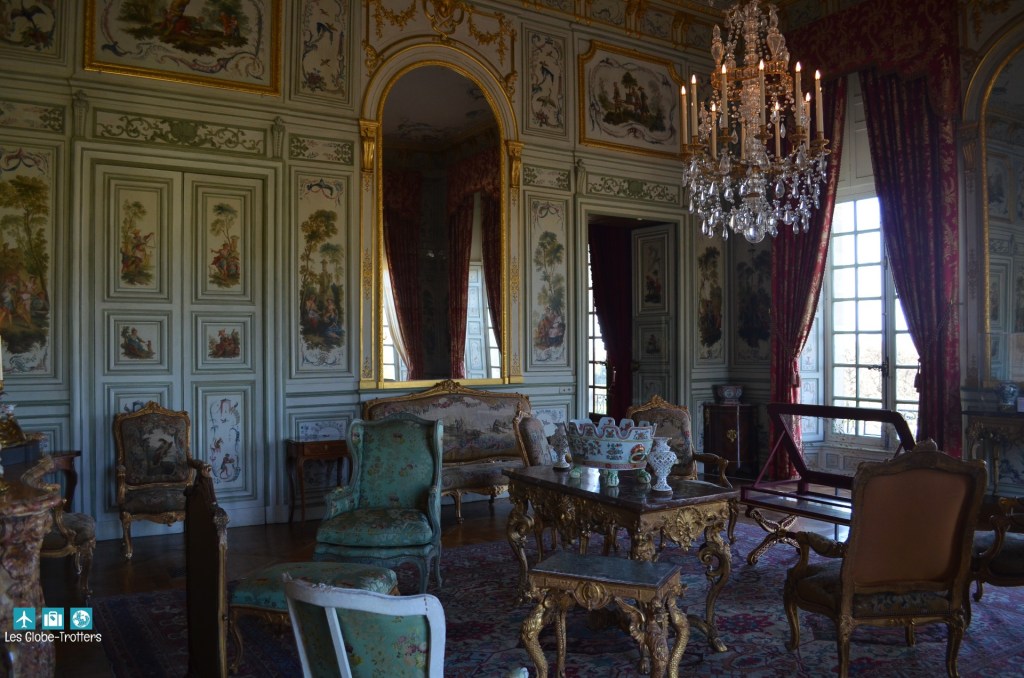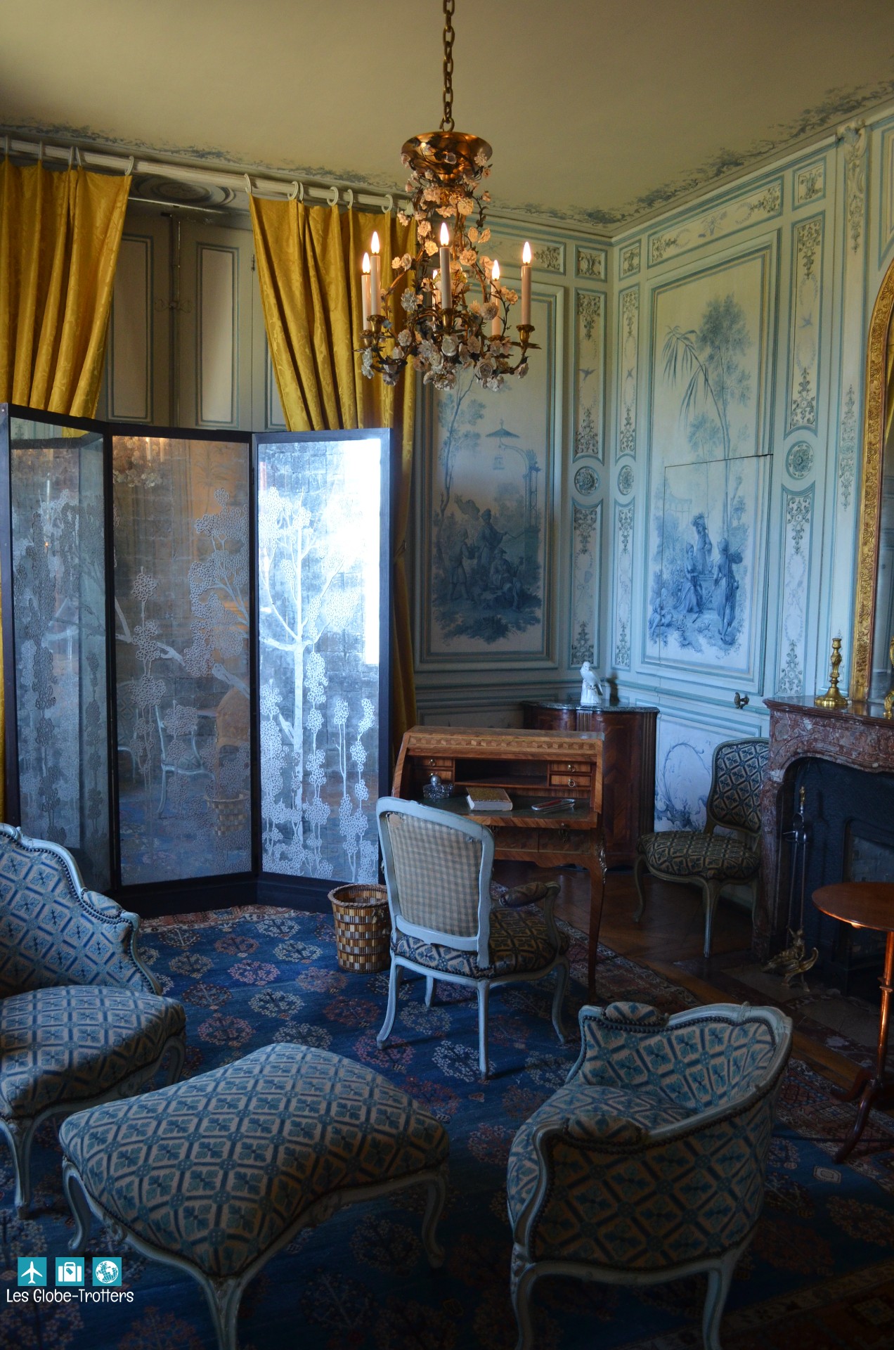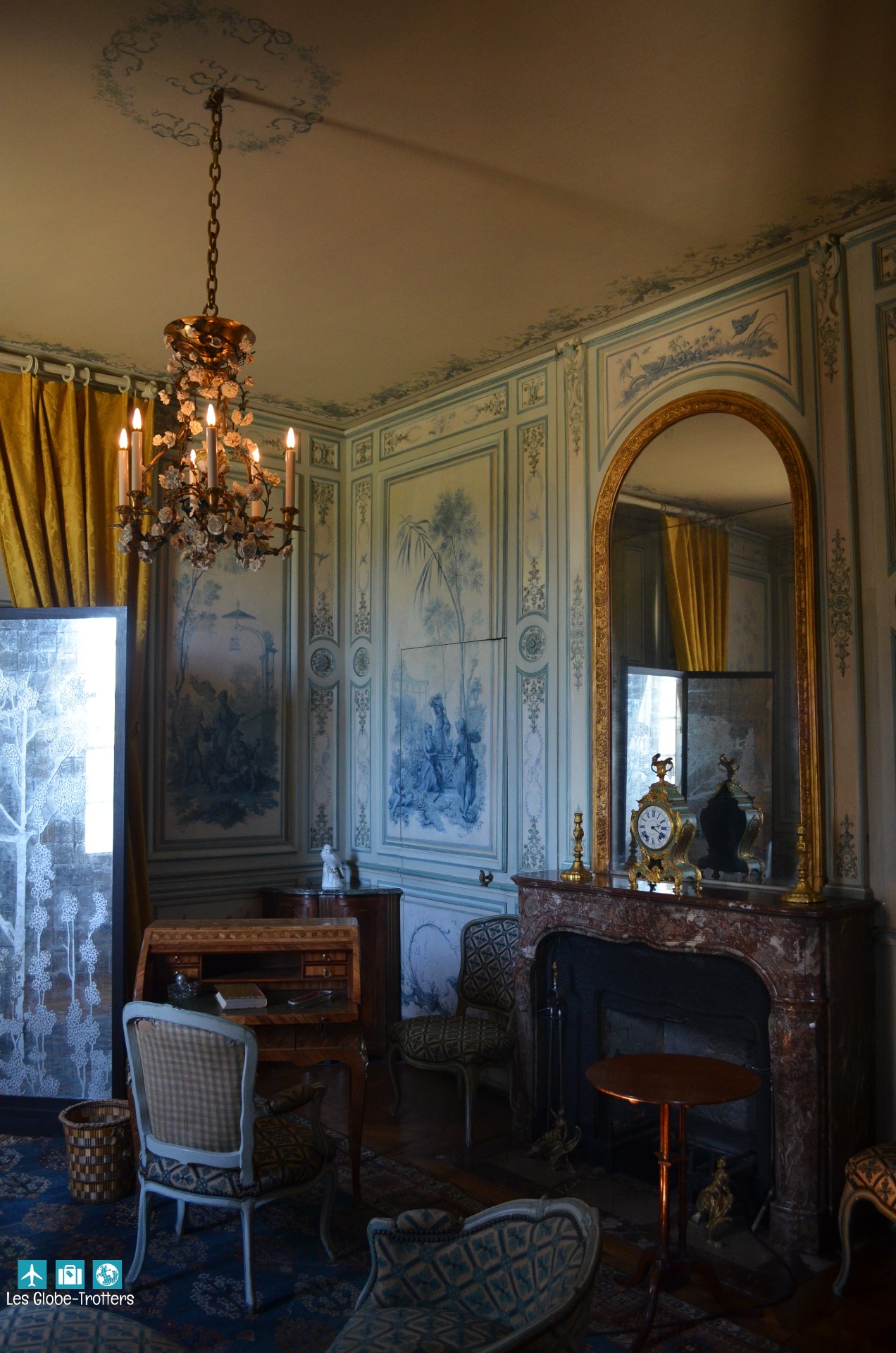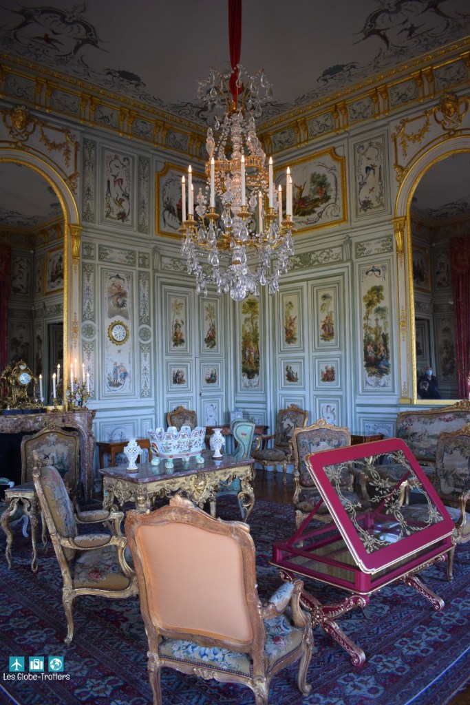 Le cabinet en camaïeu était à l’origine un cabinet de toilette. Les boiseries de 1707 sont peintes vers 1748 d’un décor de chinoiserie par Huet, dans des tons bleus.