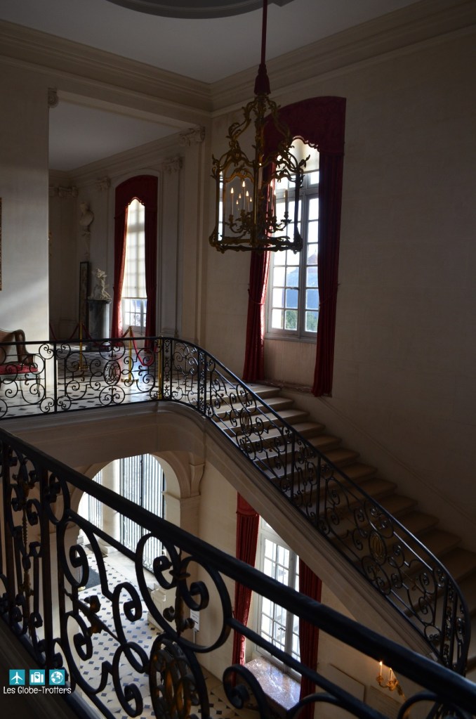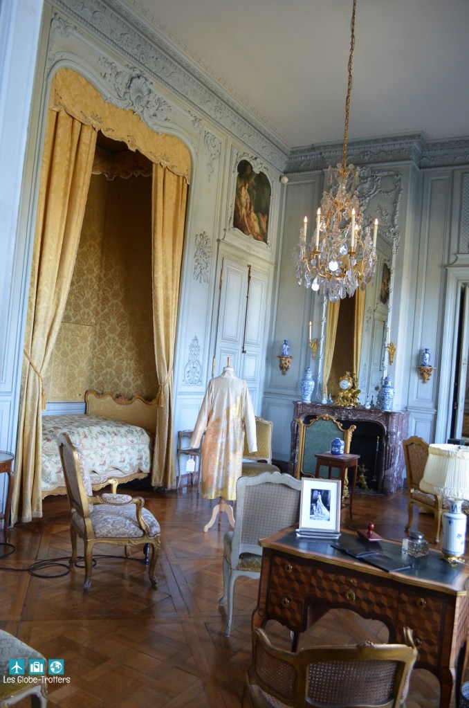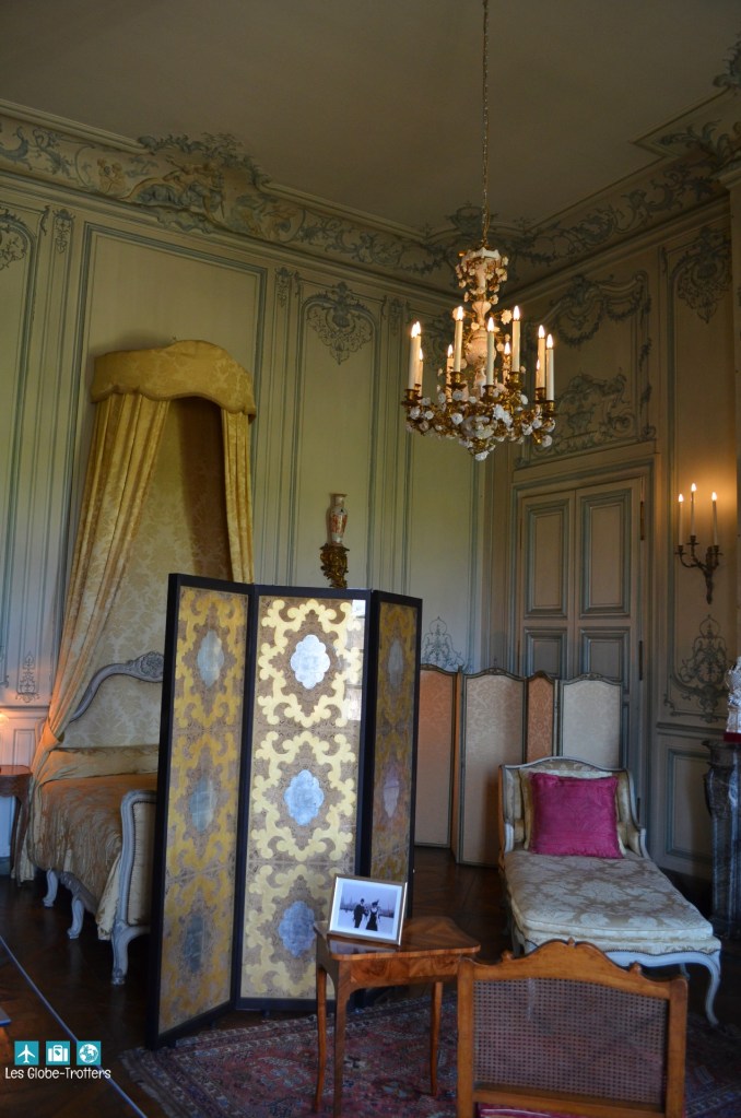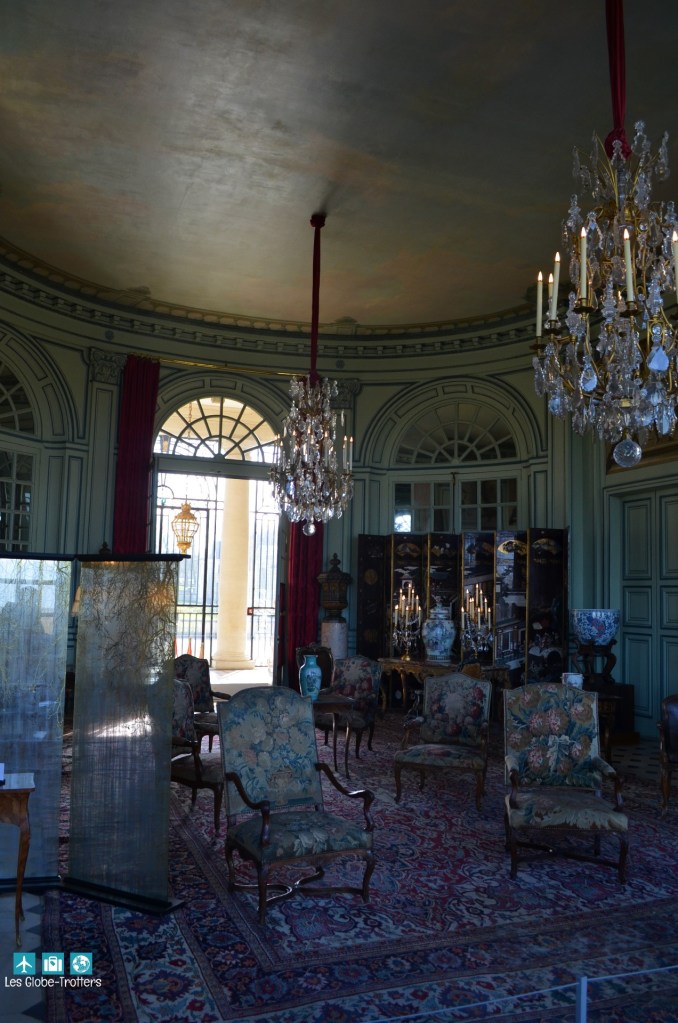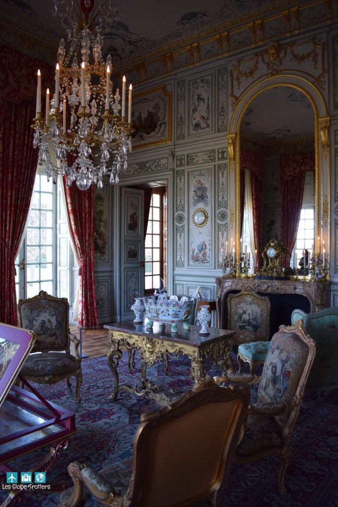 Le cabinet en camaïeu était à l’origine un cabinet de toilette. Les boiseries de 1707 sont peintes vers 1748 d’un décor de chinoiserie par Huet, dans des tons bleus.