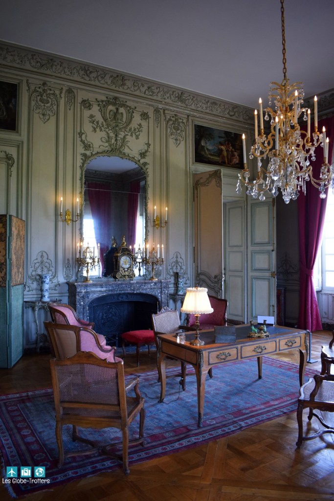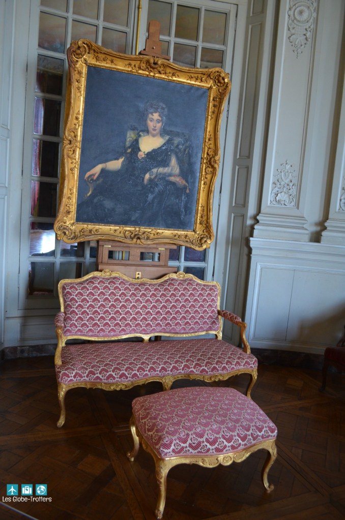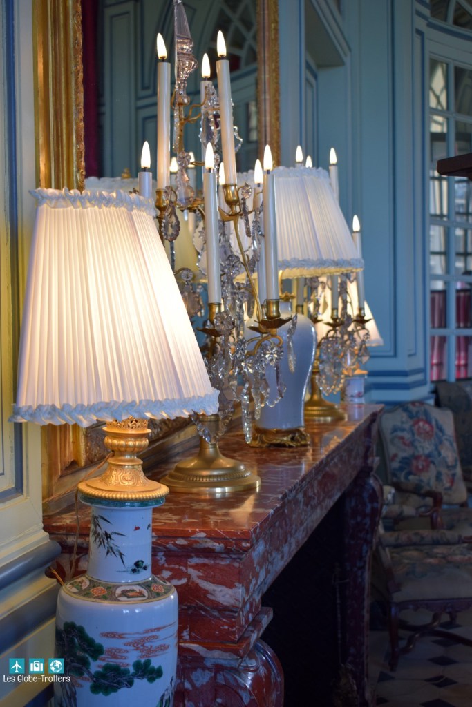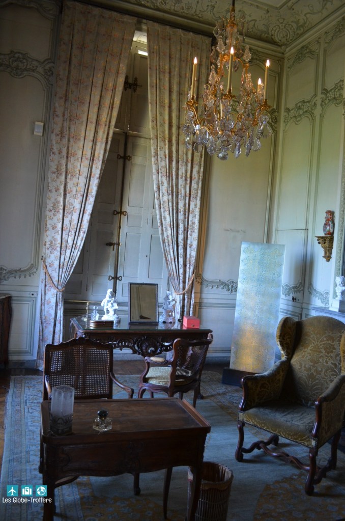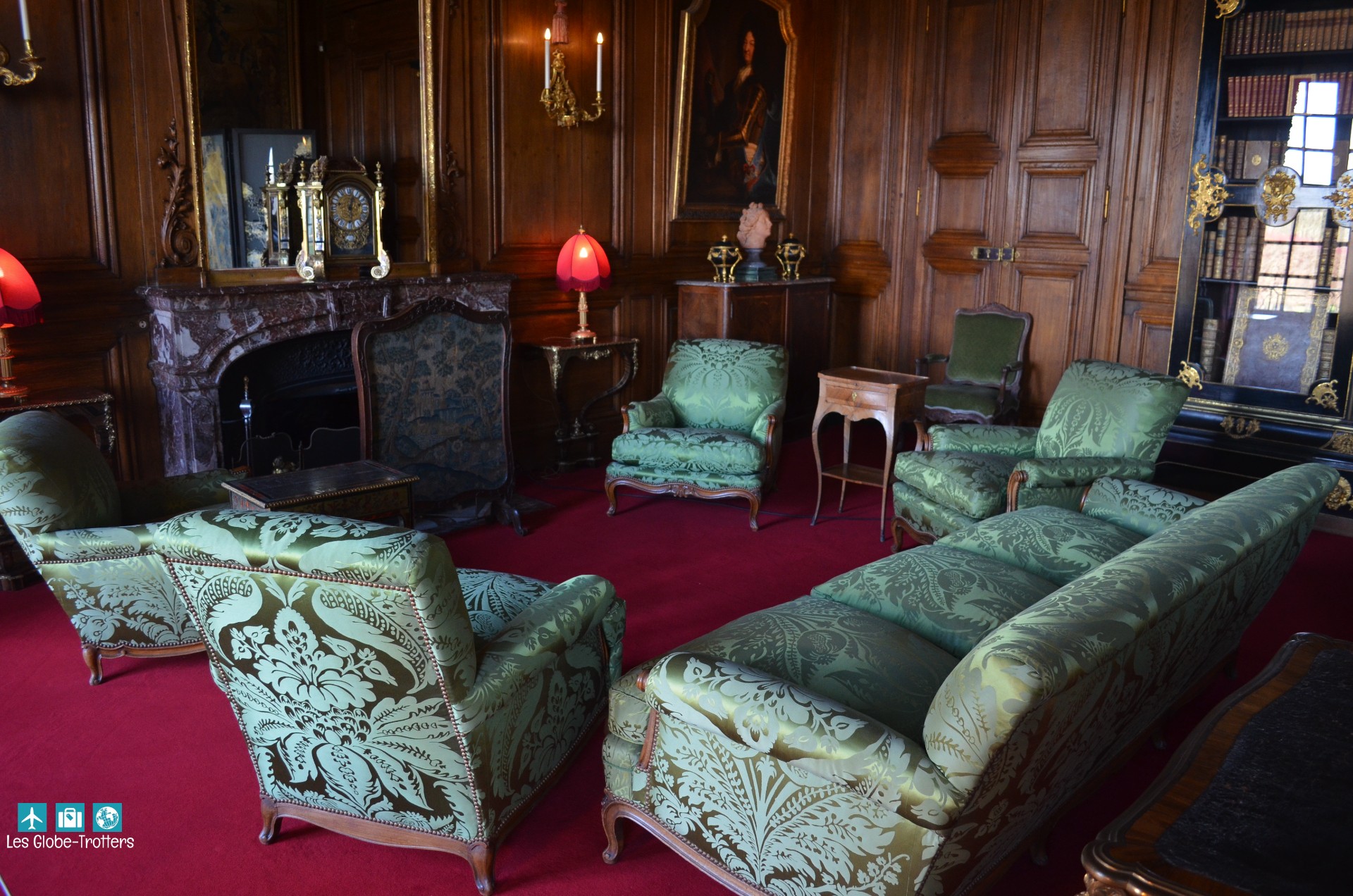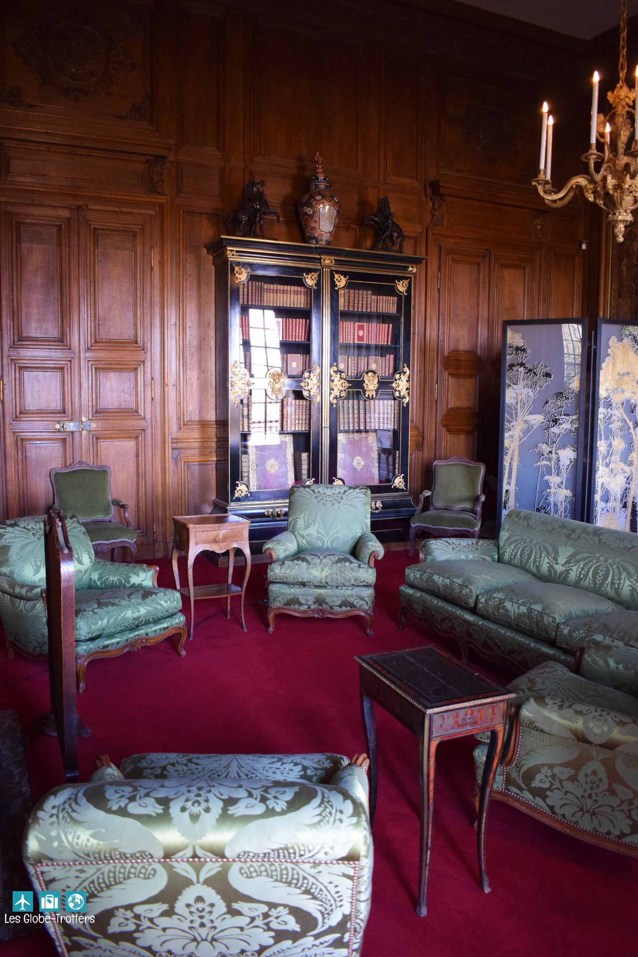 Le fumoir est un espace masulin qui communique avec la salle de billard. La tapisserie tissée à Beauvais au XVIIIe siècle représente l’empereur chinois Kangxi (1662-1722) en voyage.