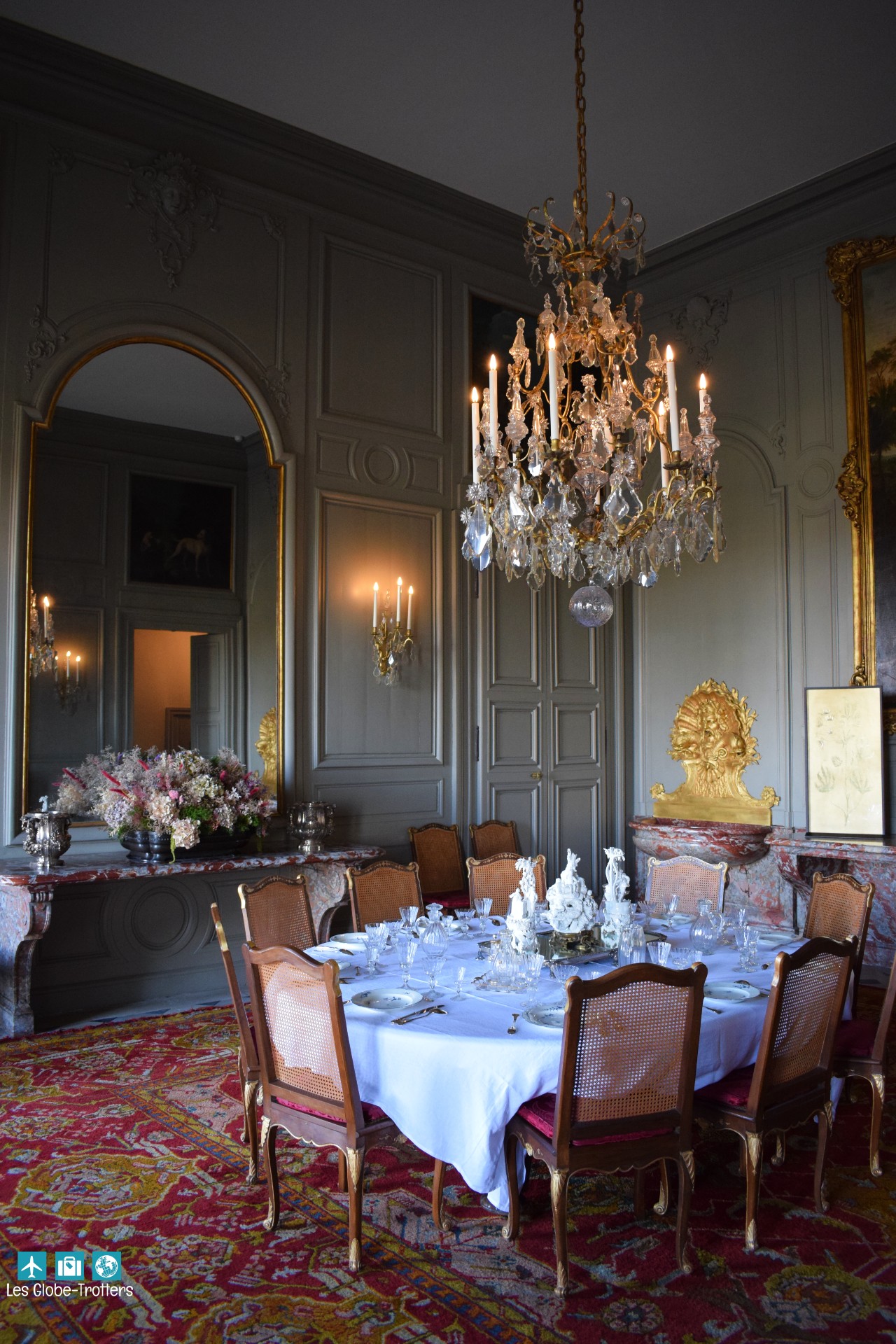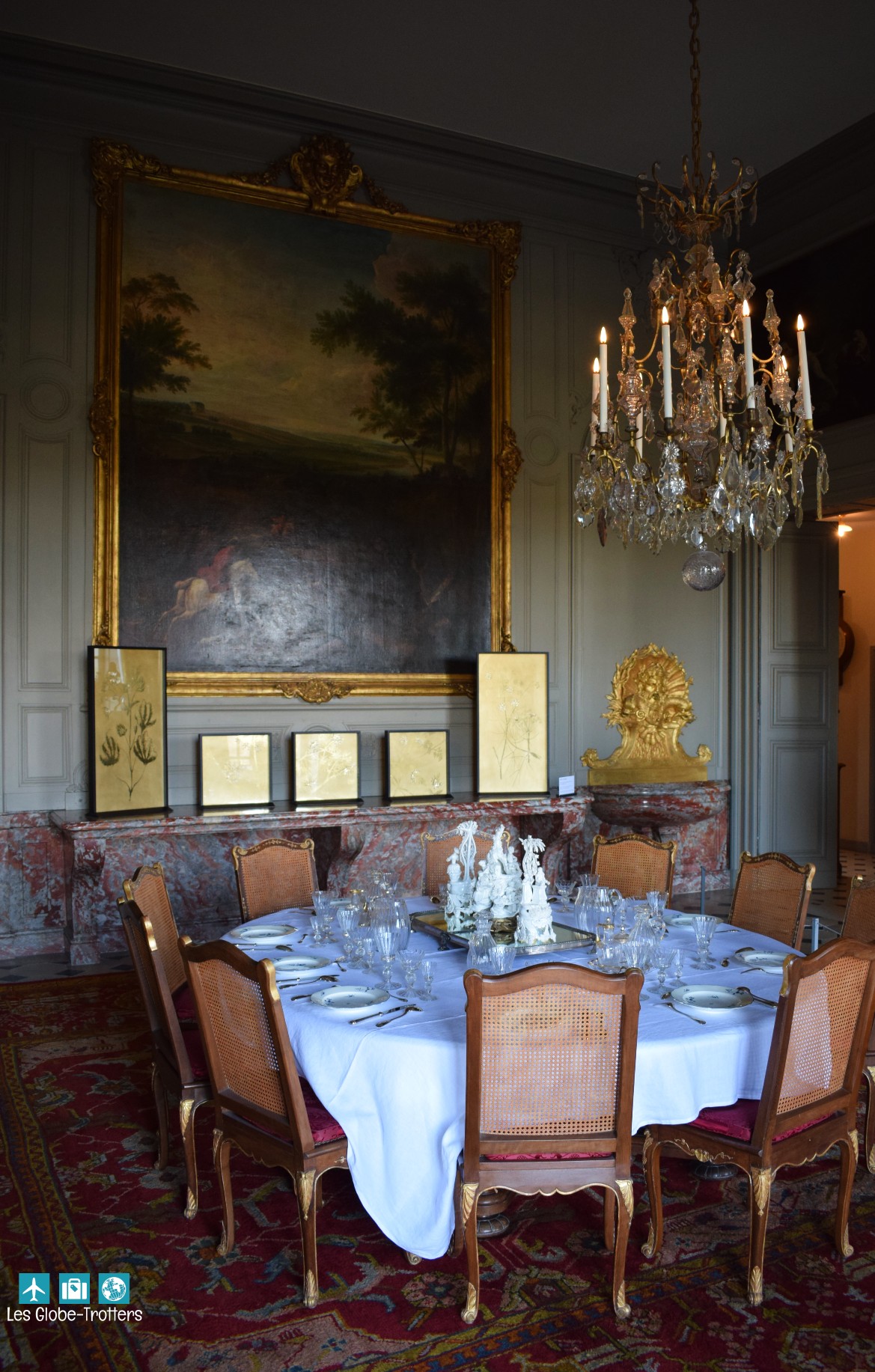 La salle à manger est un exemple précoce d’espace consacré à ce seul usage. Les consoles et vasques sont en marbre du Minervois.
