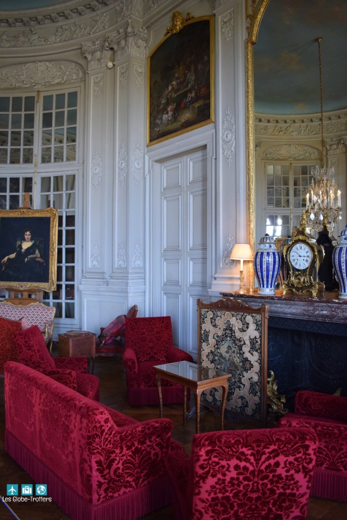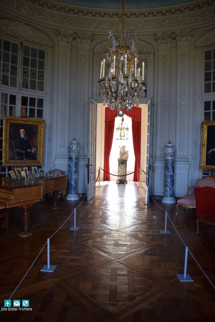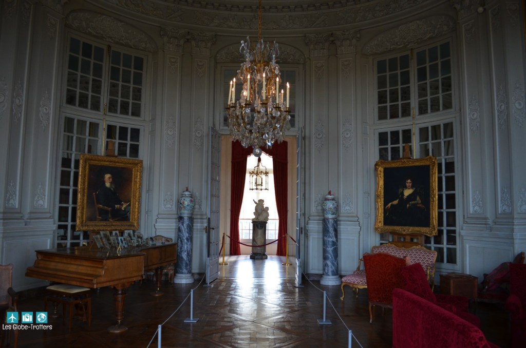 Le salon de musique offre une vue exceptionnelle sur les jardins. Vingt pilastres s’intercalent entre fenêtres, portes et miroirs. La vocation musicale de cet espace date du XIXe siècle comme l’indique le décor de la frise. Les portraits de Louis et de son épouse symbolisent l’importance de leur statut social.