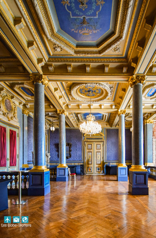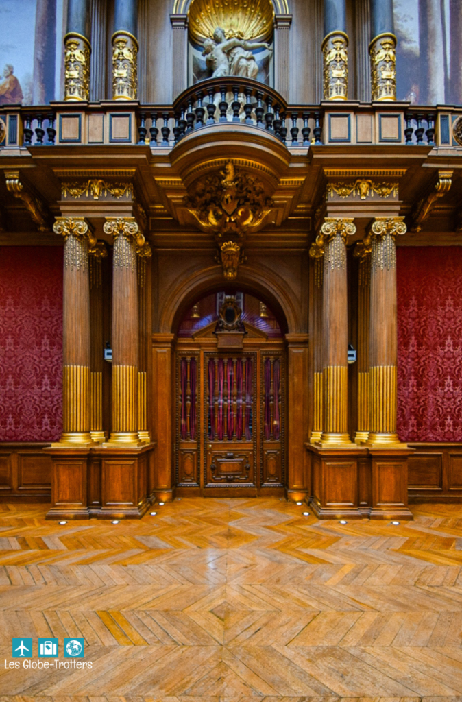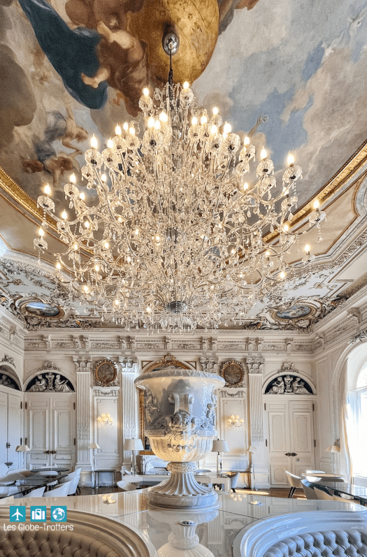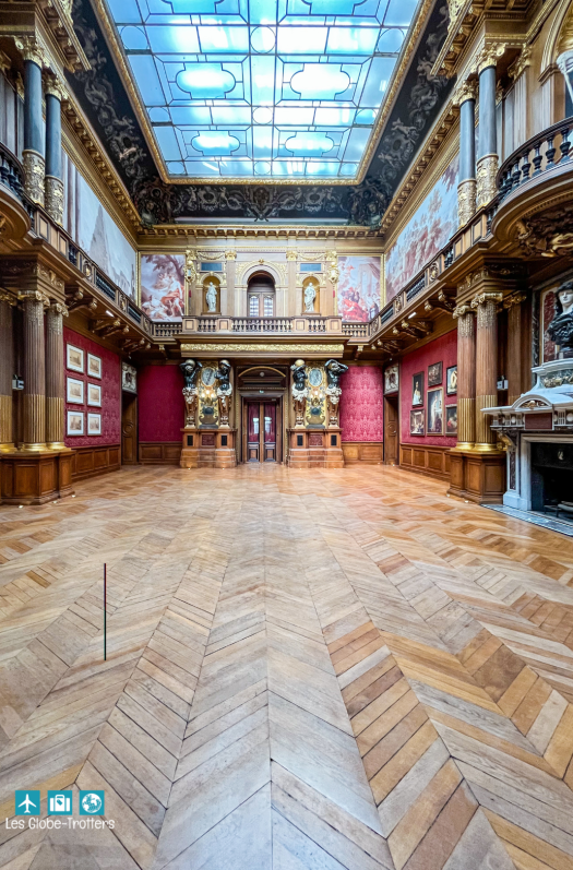 Dès l’entrée, on est saisi par la solennité du grand hall : colonnes élancées, voûtes peintes, escaliers monumentaux. Ici, chaque détail semble avoir été pensé pour impressionner, séduire, magnifier.