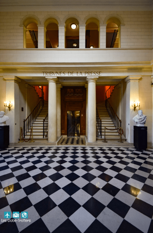 La verrière, la tribune du président, les bustes des grandes figures républicaines donnent à l’ensemble un caractère solennel, presque sacré. Il flotte dans l’air une concentration singulière, celle du pouvoir en action.
