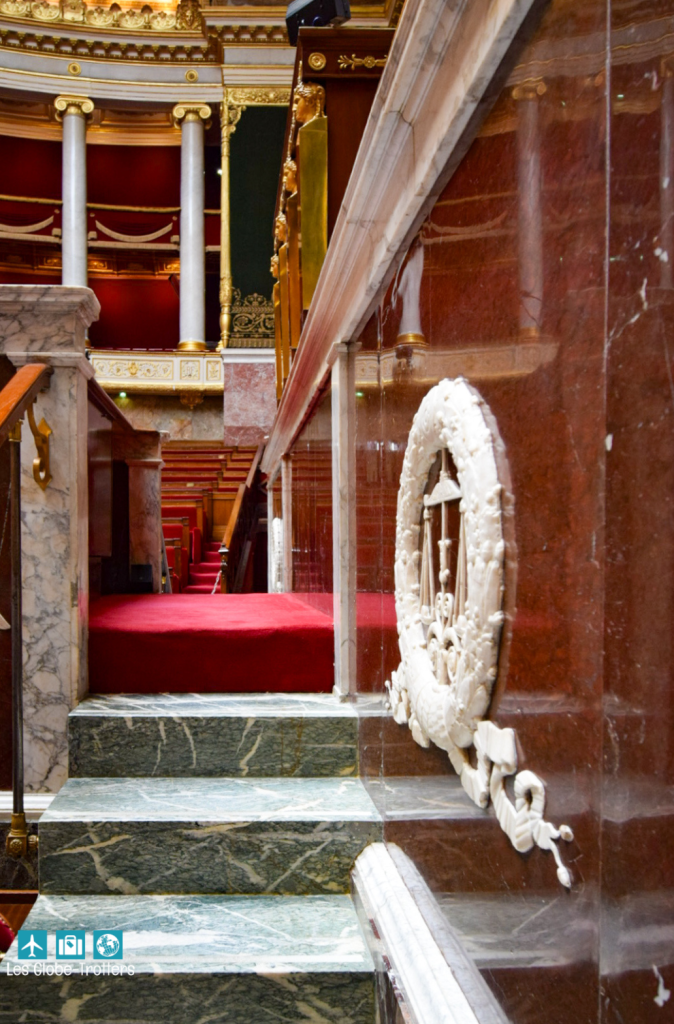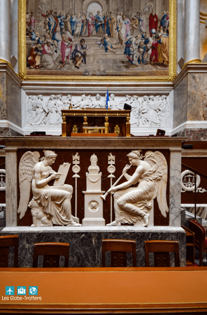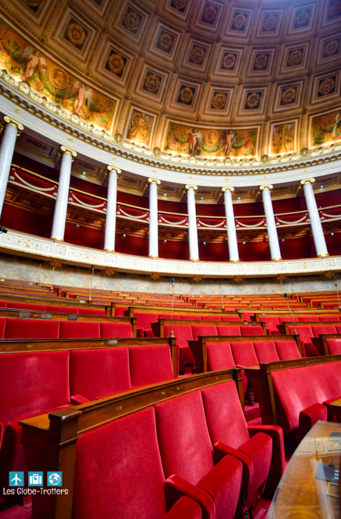 Moment fort de la visite : la découverte de l’hémicycle. Ce demi-cercle de velours rouge, avec ses 577 sièges de députés, vibre encore des grands discours de la République. C’est là que se discutent les lois, que se croisent convictions et contradictions. Un lieu que l’on a l’habitude de voir à la télévision… et qui impressionne bien plus en vrai.